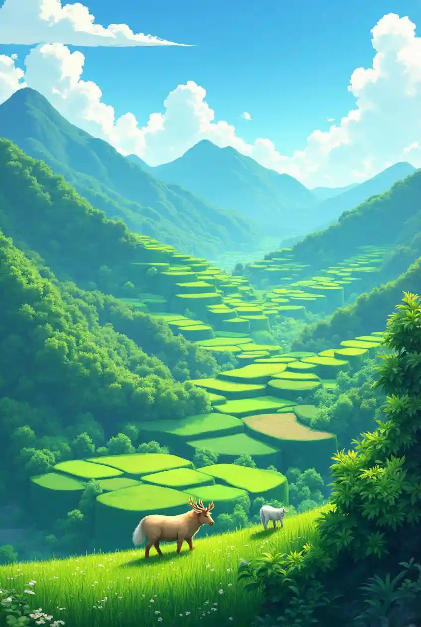 Ruh hayvanları tarafından korunan, serin bir anime çobanlık tarzında, verimli bir çiftlik.