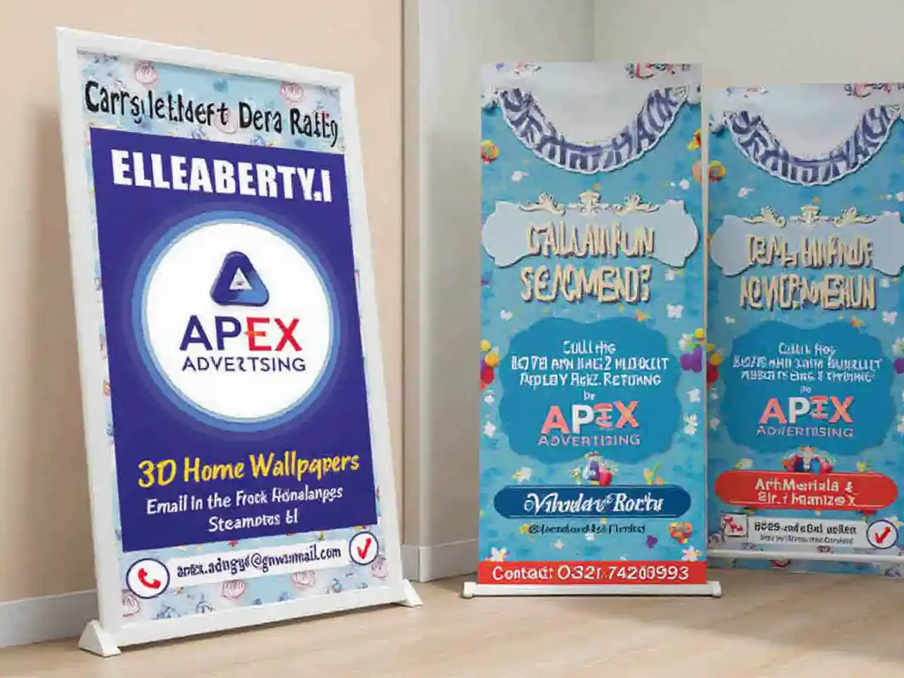 "APEX Reklam" adında esnek baskı şirketi için bir banner tasarımı. Bayrak 3 boyutlu ev duvar kağıdı, panolar ve buharlar gibi hizmetleri içerecek. Şirketin logosunu belirgin bir konuma yerleştirin. Tasarım, sunulan yüksek kaliteli hizmetleri yansıtan modern ve profesyonel olmalıdır. İletişim bilgilerini açık bir şekilde ekleyin: "E-posta: apexadgrw@gmail.com" ve "İletişim: 0321-74993". Arkaplan, işyerinin sunduğu hizmetleri vurgulayan temiz ve zarif bir tasarımla göz alıcı bir şekilde yapılmalıdır. Panto görünüşte çekici olmalı ve dış ve iç reklamları için uygun olmalıdır".