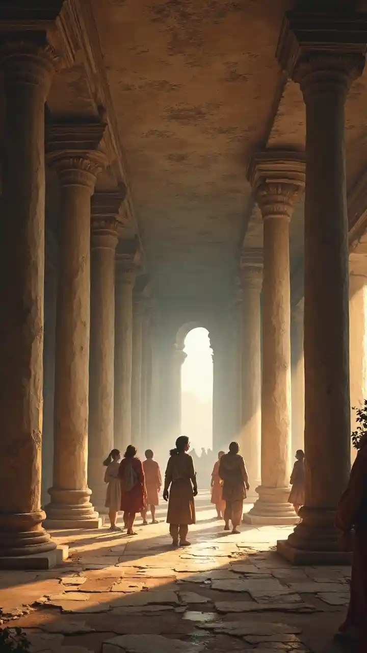 Bir grup insan sütunlu büyük bir odada duruyor ve sütunlu bir tavan, Claire Dalby, samikshavad, ton haritası, bir mağara resmi. animasyon stili oluştur