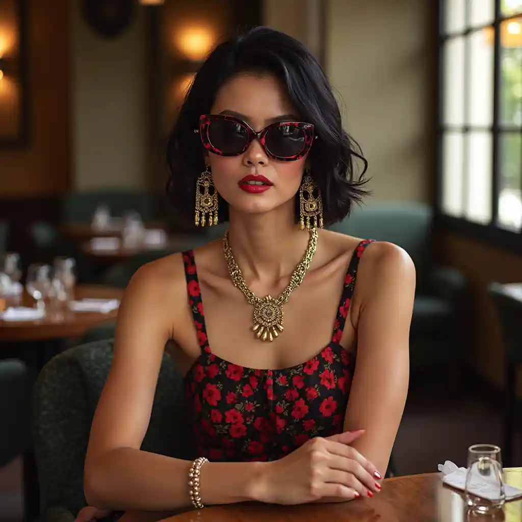 EleanorBüyük geometrik küpe güneş gözlüğü ve kolye kısa siyah saç kırmızı dudak İtalyan tarzı dolce ve gabana Asyalı kadın model portalı nous Mallorca zarif oturma restoran deri çanta