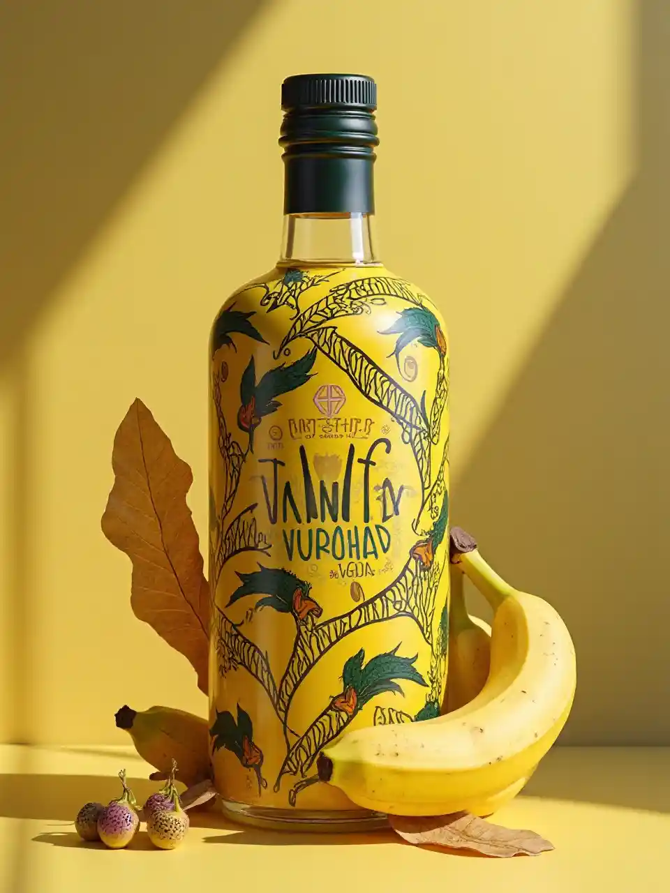 Bir muz votkası markasının ambalajı ve markası, HI ESTUDIO tarafından muz, ejder meyvesi ve kuru muz yapraklarıyla tasarlanmıştır.