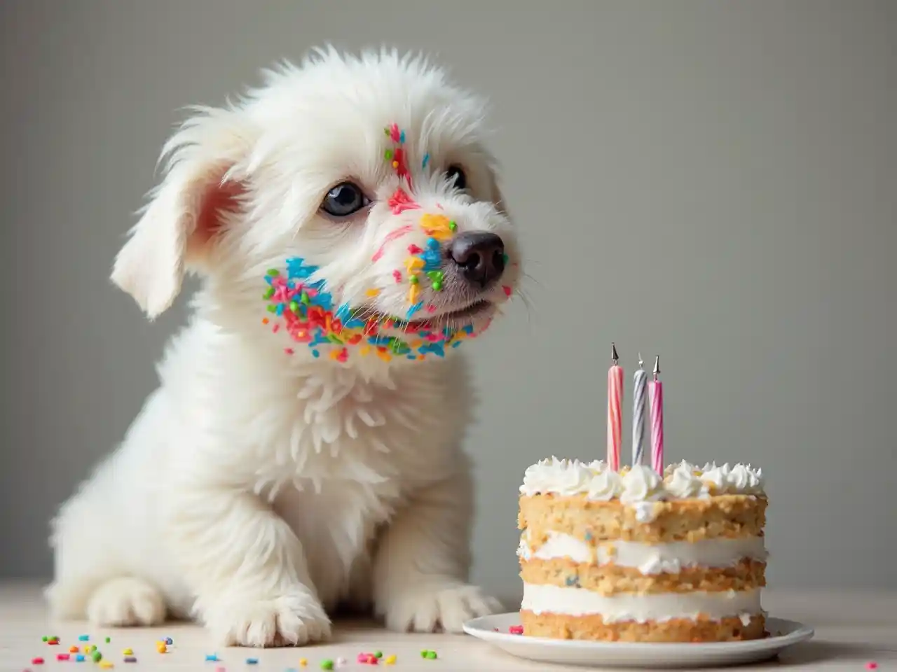 Yüzüne boyanmış renkli bir kekle beyaz bir köpek, mumlarla birlikte bir doğum günü pastasının yanında oturur.