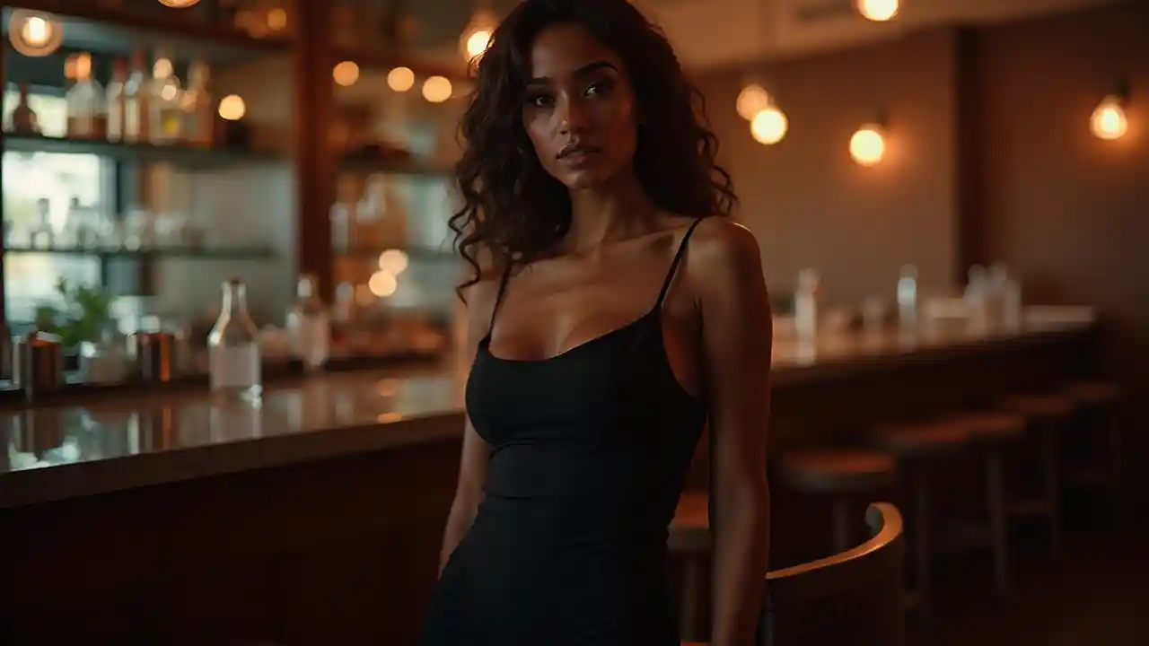 LincolnSiyah bir elbise giyen, siyah bir kadın, modern bir barın yumuşak ışığında duruyor. Eğri kumaşları, kıvrımlarını mükemmel bir şekilde vurgular ve sıcak ifadesi herkesin dikkatini çeker.
