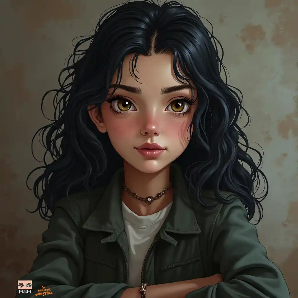 Uzun siyah saçlar, açık mavi gözler, ince bir vücut, şişman kırmızı dudaklar, gözlerinde açık mavi gölgeler, korsetli bir gömlek, yüksek bir topuklu bir ayakkabı.