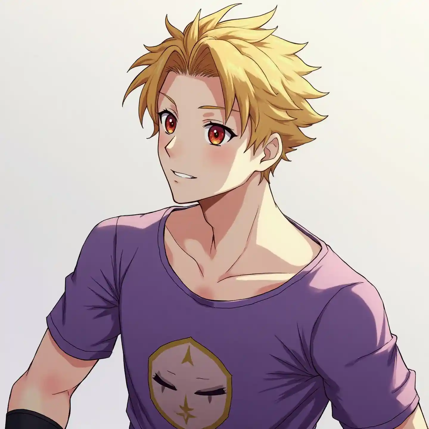 (Bir genç erkek, kaslı, kısa sarışın saç, asimetrik saç stili, mercan göz rengi, kırmızı göz rengi, tilki gözbe şekli). (Kızıl bir ceket giyen erkek