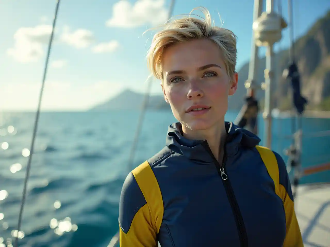 (sarışın kadın, ince vücut, kısa peri saç modeli), (anlamlı mavi ve sarı nemli), (Sakit Okyan'da bir yat güvertesinde duruyor), (yüksek çözünürlük), (fotorealistik), sinematik aydınlatma, maceracı ortam, nefes kesici renk kontrastları, (4K) kalitesi.
