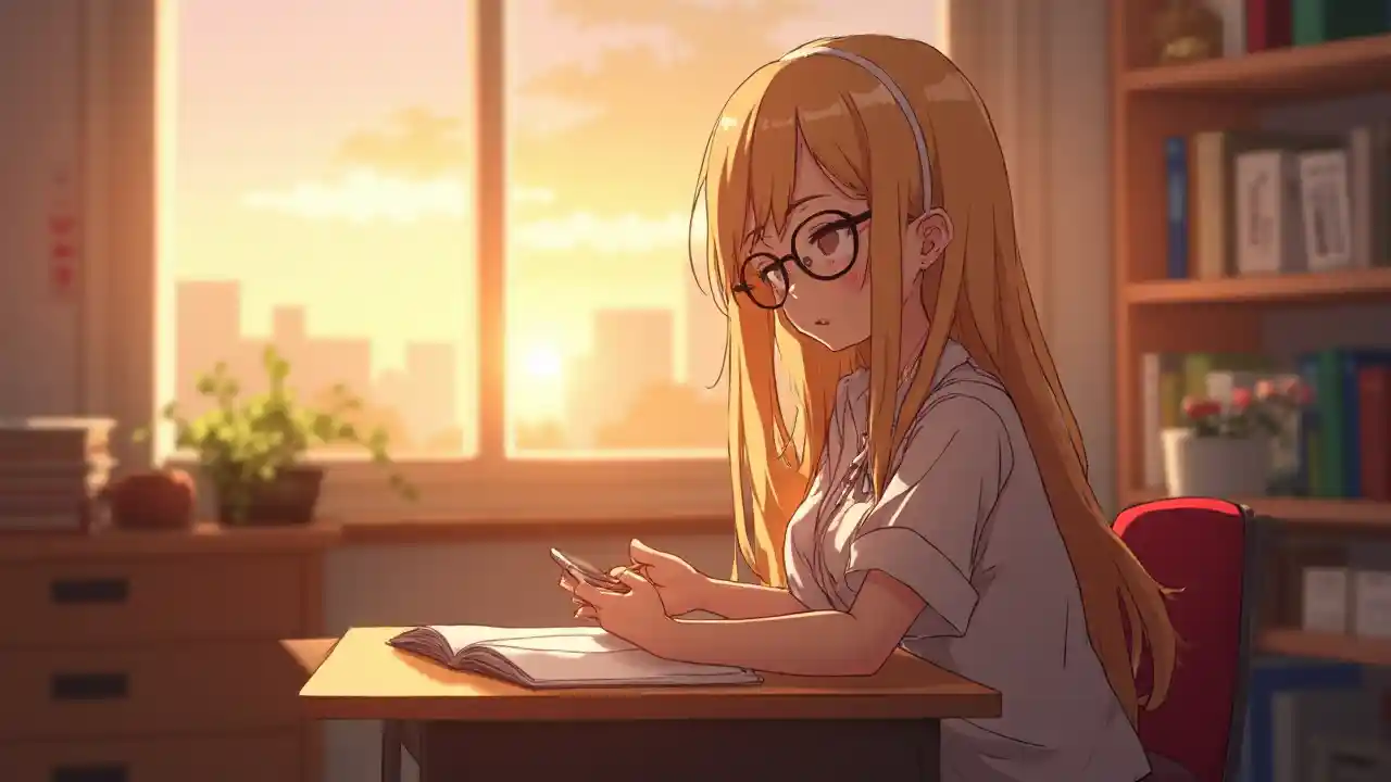Uzun sarışın saçlı, gözlüklü anime kızı masada oturup kitap okuyor, okuldan sonra sınıfta dinleniyor, sıcak güneş batışı, video döngüsü