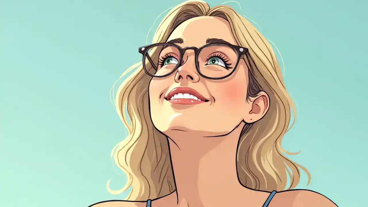 Sarışın saçlı ve gözlüklü gülümseyen bir kadının resimleri.