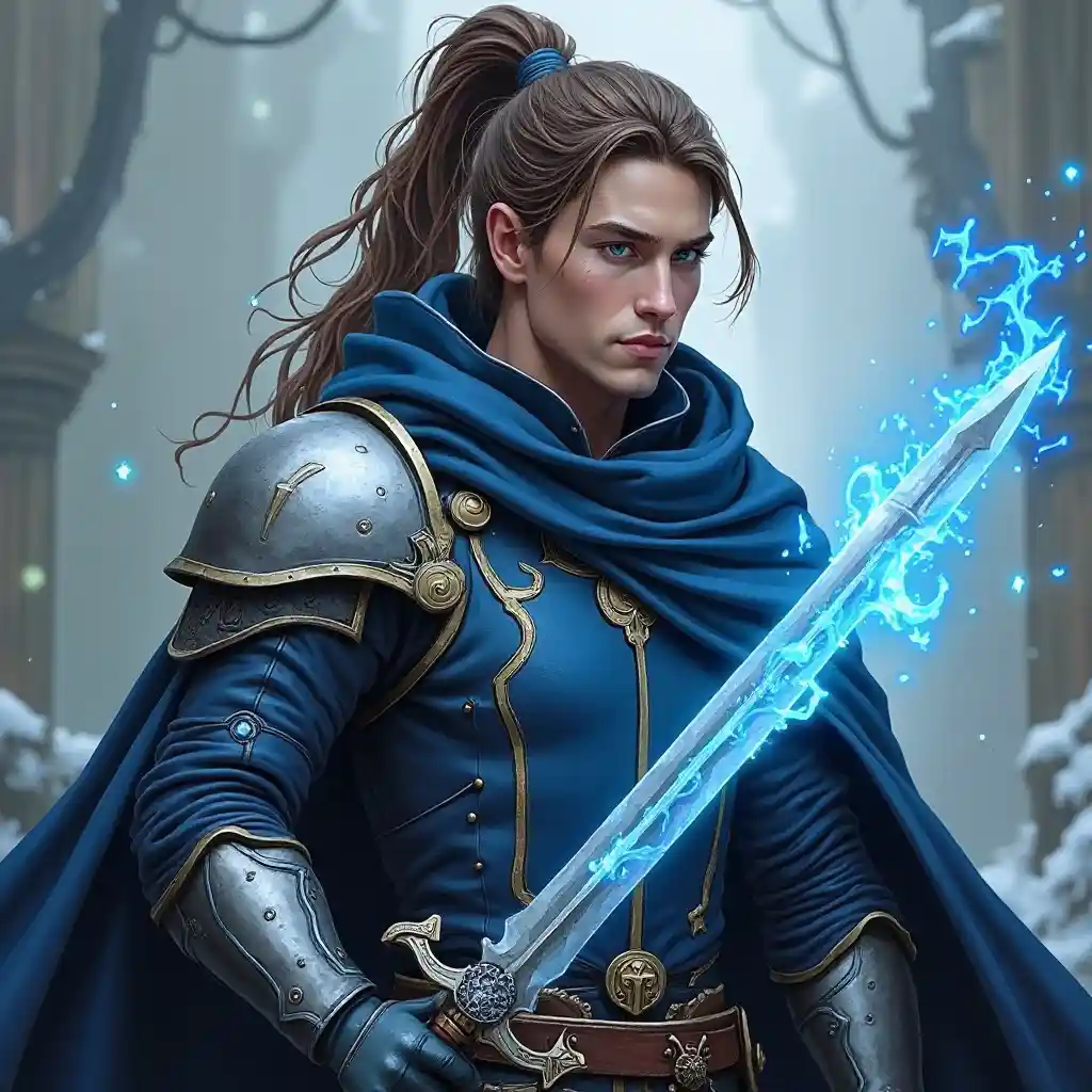 Genç yetişkin erkek Uzun kahverengi saçlar, yüksek at kuyruğu, mavi gözler, temiz traş edilmiş Mavi ve gümüş deri zırh ve koyu mavi bir pelerin giyen bir savaş sihirbazı, bir elinde kılıç ve diğerinde mavi beyaz büyü