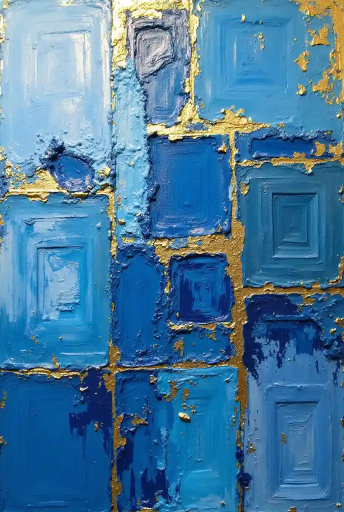 Tamamen yağlı boya, mavi yağlı boya ve altın yaprağından yapılmış soyut bir tablo.