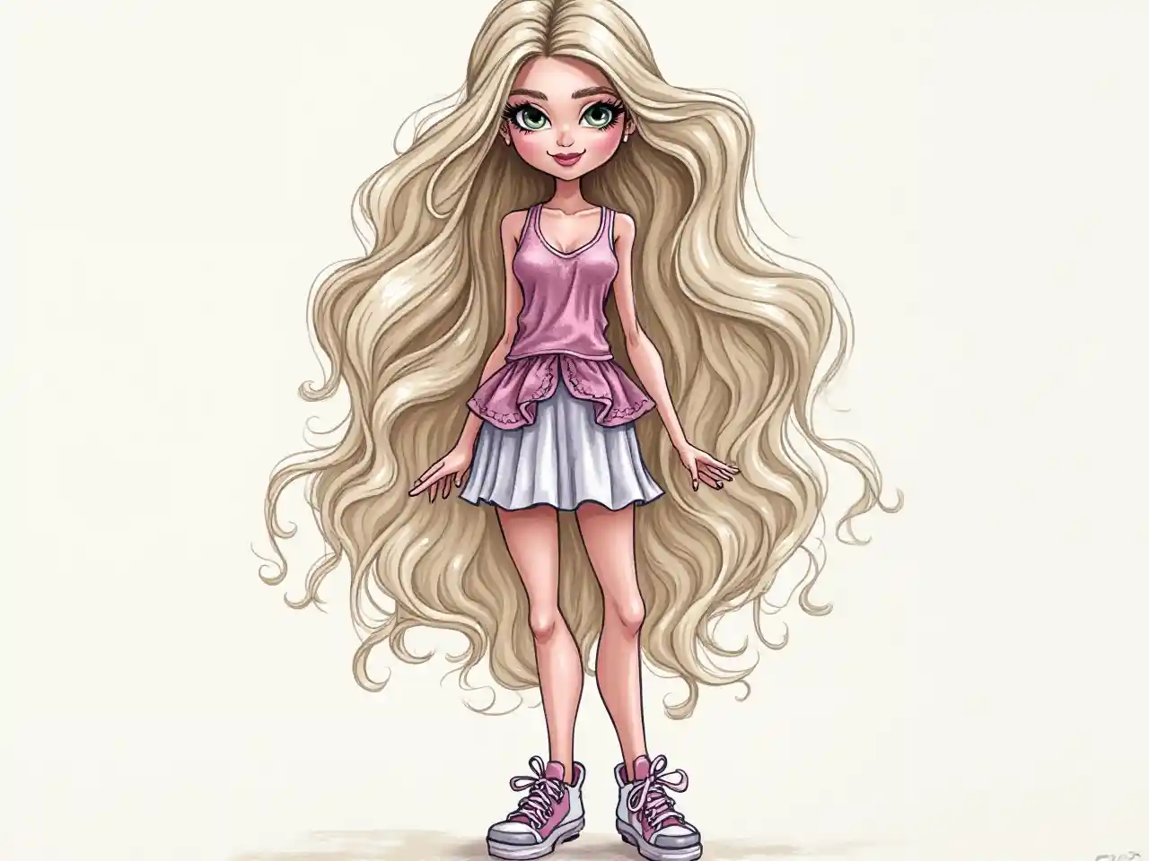 1 kız, güzel kız, solo, bratz bebek gibi, bratz karakter tasarımı, çizim illüstrasyon stili, çizim sanatı, tam uzunluklu çekim