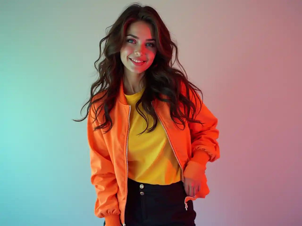 (80'li yılların esmer kadını), Patrick Nagel tarzı, parlak mavi gözler, uzun dalgalı saçlar, açılı yüz, turuncu bombardıman ceketleri, sarı tişörtler, siyah mini etekler, kıvrımlı figürler, pastel arka planlar, parlak ışıklar, neşeli ortamlar, yüksek detay ve kalite, (8K), (ultra-gerçekçi), canlı renkler, sinematik derinlik, şık poz, neşeli ifade, moda-önce, aydınlık, modern estetik.