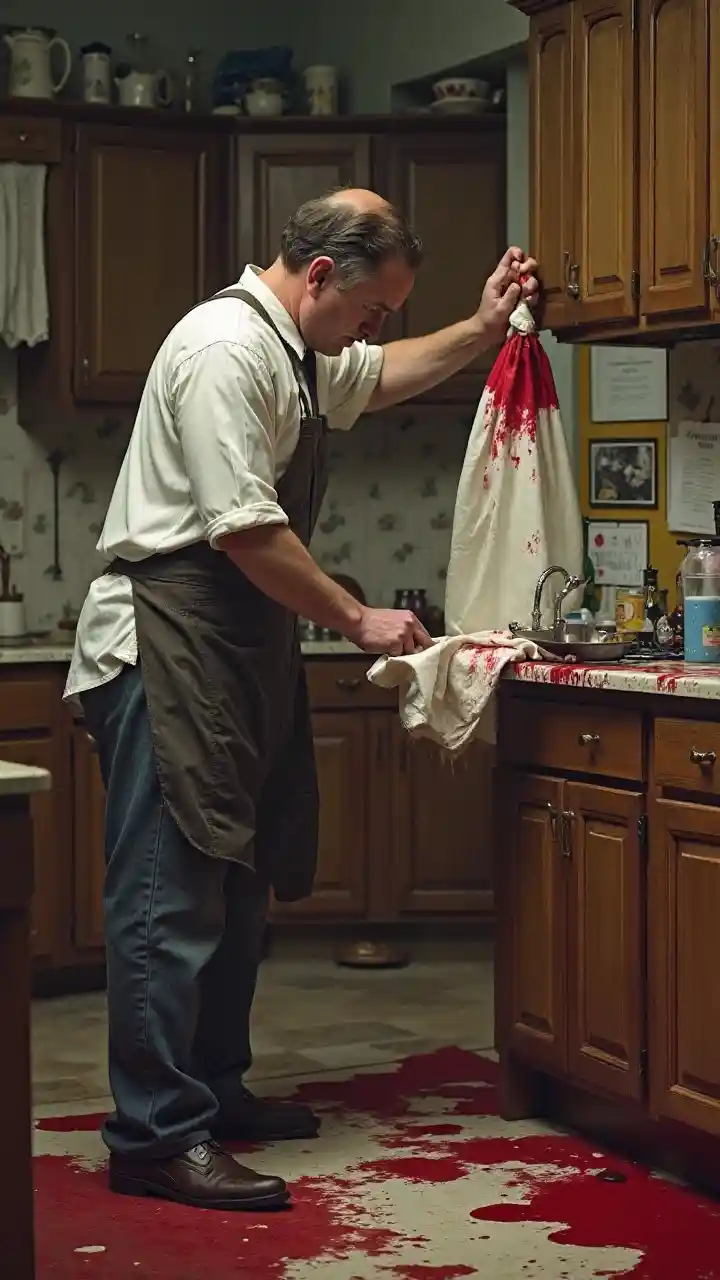 Hizmetçi, kanlı mutfak sahnesi temizliyor