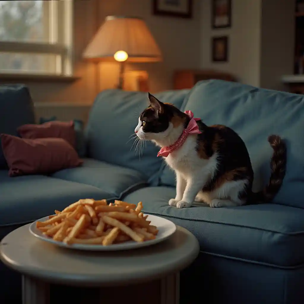 Mavi bir kanepede yaylanarak pembe bir yay giyen bir Calico kedisi, kedi yaylanarak mavi kanepeye yakın küçük yuvarlak masada balık ve patateslere bakıyor. Oda, güneşin batışıyla hafif aydınlatılmış, sıcak bir tonla, oda 1970 fotoğrafları ile ayarlanmış.