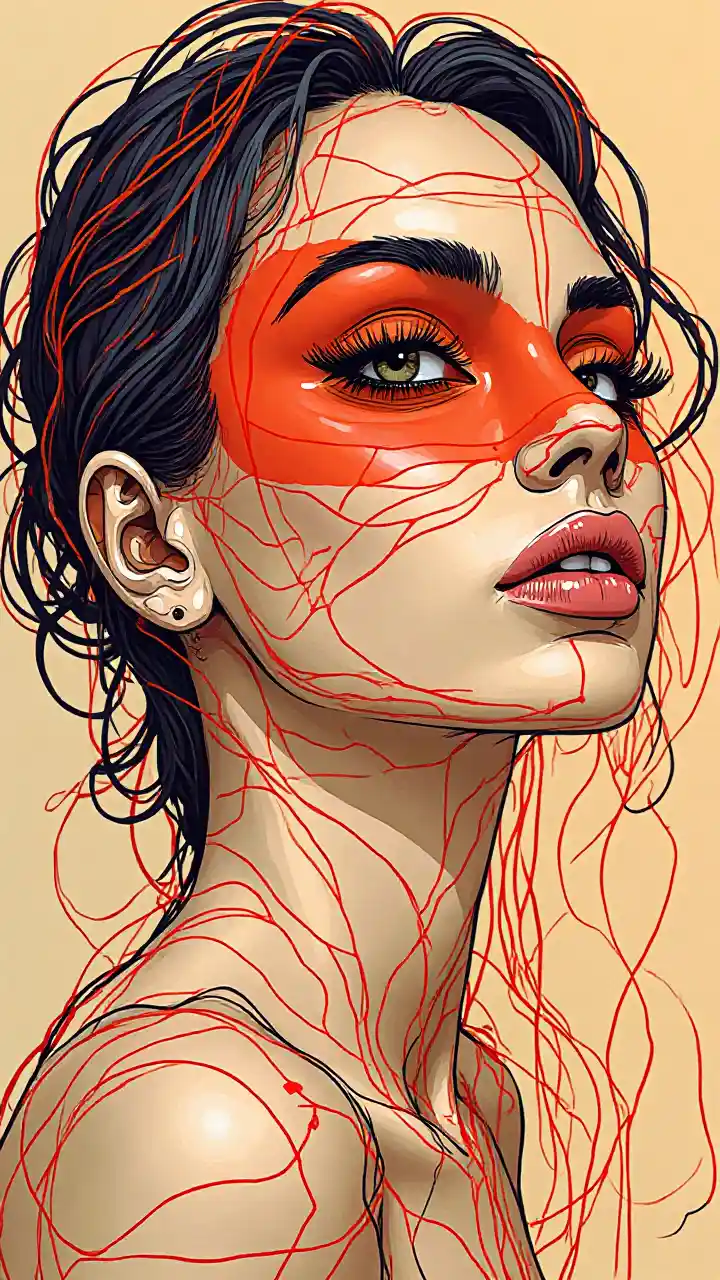 Parlak kırmızı göz gölgeleri ile bir kadının yüzünün büyüleyici bir portresi, koyu bej ve turuncu bir paletle cesur, renkli çizgiler kullanılarak tasvir edilmiştir. Kompozisyon, karmaşık bir tel çerçeve yapısını taklit ederek, çiğ ve keskin bir çekicilikle kusursuz bir çizgi çalışması sunuyor. Sanat eseri, renk ve tekniklerin yenilikçi kullanımı ile derinliği ve ifadeleri uyandırır.