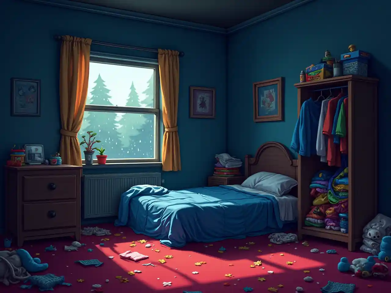 Derin kırmızı halı, solmuş mavi duvarlar ve siyah tavanla hafif aydınlatılmış bir yatak odasının dijital karikatür tarzı. Yatak odanın uzak köşesinde, kırışık mavi bir battaniye ile süslenmiş. Yatağın yanında, bir pencere, yağmurlu bir gün dışarıda, damlalardan ormanın sisli çizgileri görülebilir. Oda, yeryüzünde saçılmış çeşitli renkli oyuncaklarla dolu. Yakınlarda yarı açık bir gardrobe var. İçeriği renkleriyle dolaşıyor. Dağınıklığa ve karanlığa rağmen, oda, kaosun ortasında bir sıcaklık duygusu aşılayan, oyun gölgeler yumuşak ışık ile geliştirilmiş.