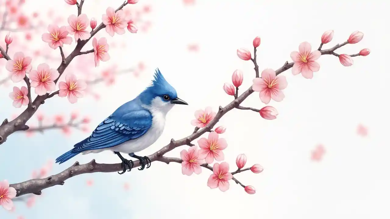 Mavi Kuş Kiraz Çiçeği Su Rengi Sanatı