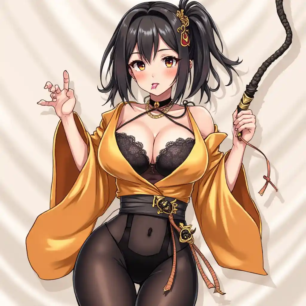 Genshin Impact'ten Chiori, orta göğüsler, orta siyah saçlar, 30 denier siyah çoraplar, kamçı veya atlılık yapması, turuncu/sarı kısa kimono giymesi, siyah dantel sütyenini göstermek için açık kimono, baştan çıkarıcı ifade, dil dışarıya yalamak dudaklar, kimono çoraplarının arkasında siyah külot göstermektedir