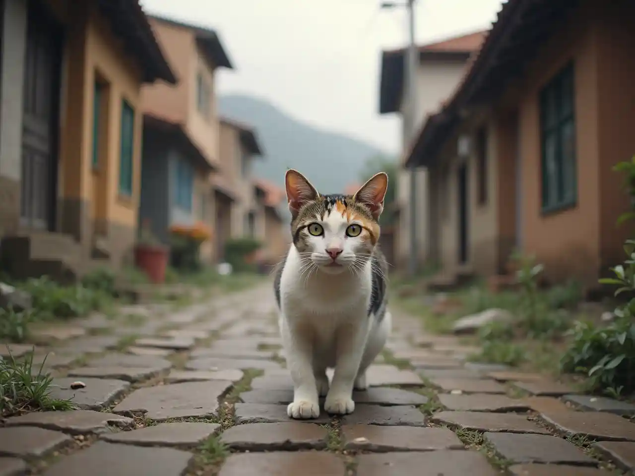 Köyün arka planında bir kedi