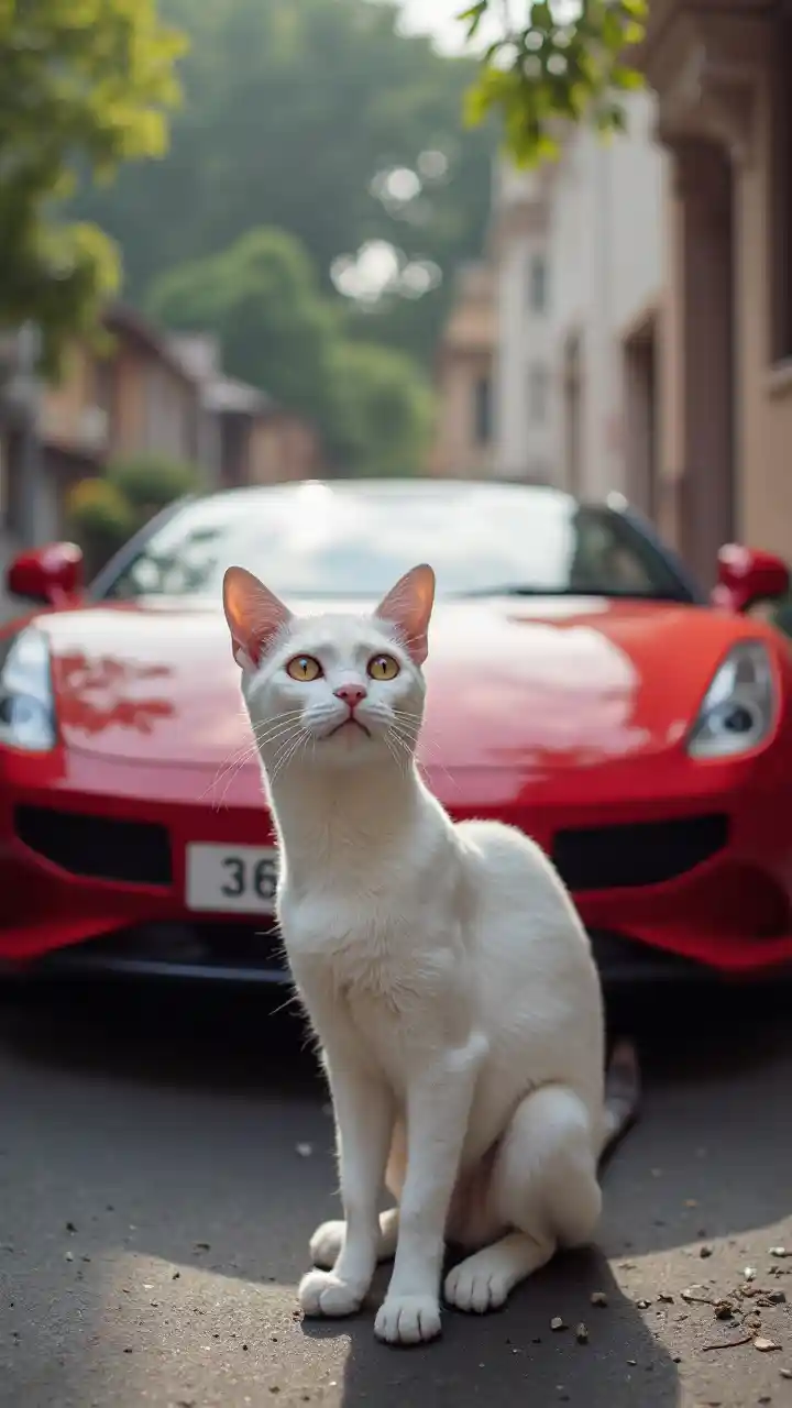 Beyaz Bir Kedinin Kızıl Bir Lamborghini'nin Önüne Koştuğu