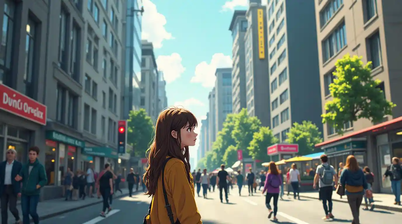 Kahverengi saçlı ve kut-tut'lu 25 yaşındaki bir kız, bir şehirdeki büyük modern binaların arasında yürüyor. Trafik ve etrafında kalabalık insanlar var, Anna merakla etrafına bakıyor ama biraz endişeli.