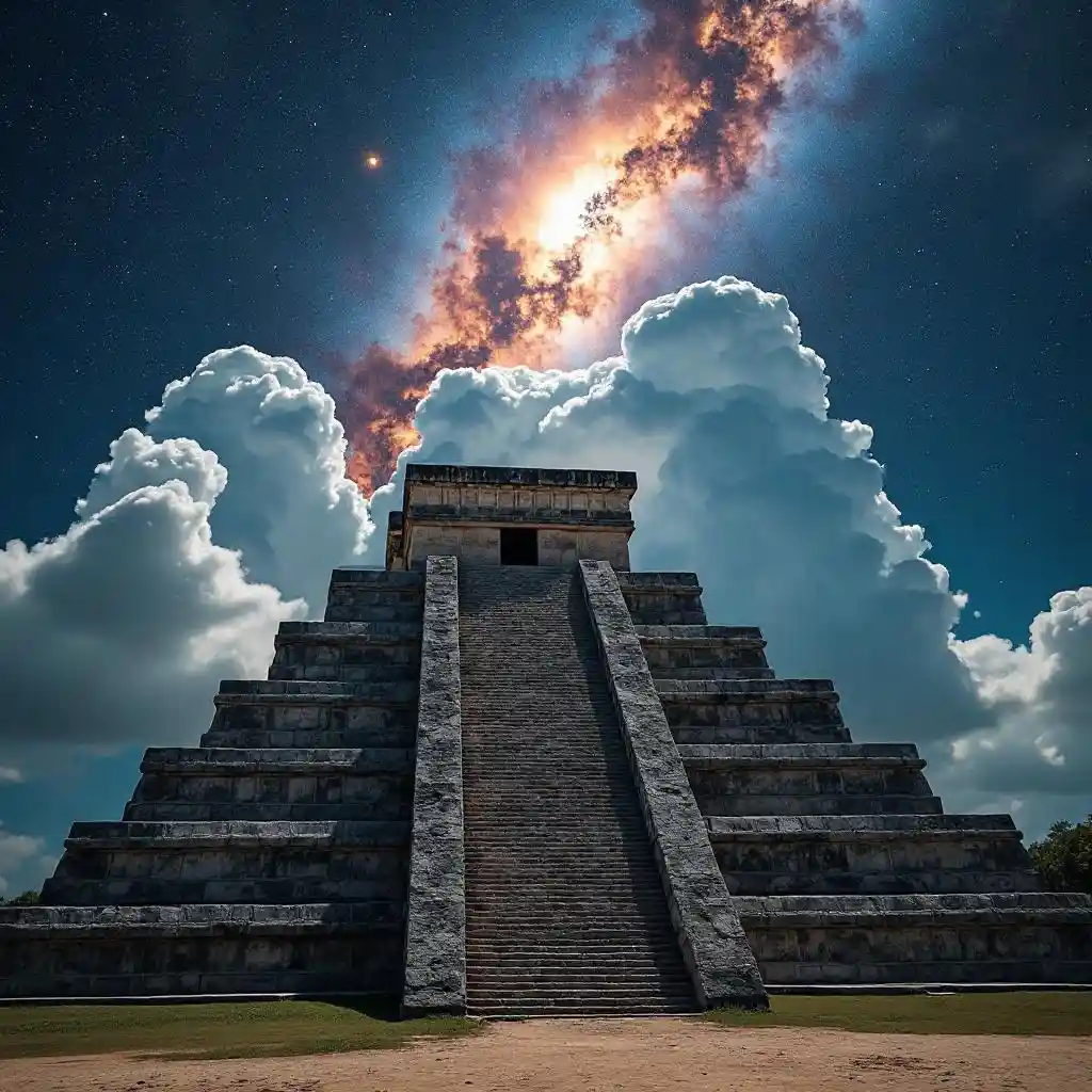 Yucatan'daki bir Maya piramitinde, kozmosuna çıkıyor.