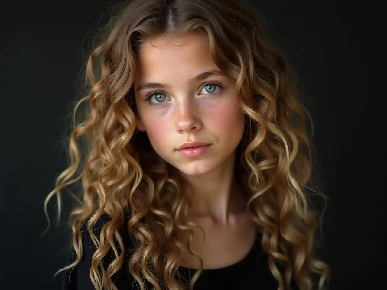 Kirli sarışın, uzun kıvırcık saçlı, koyu yeşil gözlü, güzel siyah kıyafetli 15 yaşında bir kız