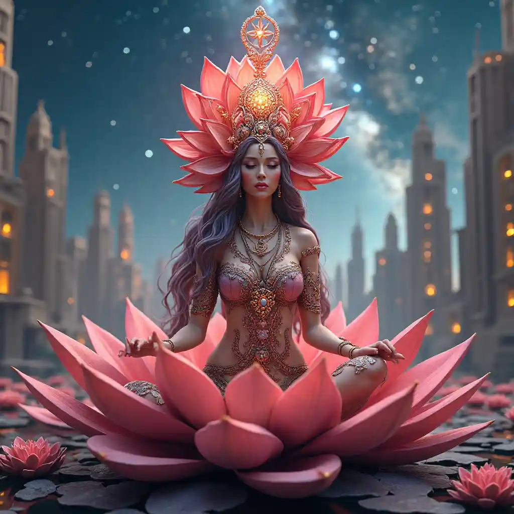 Çiçek kraliçesi tanrıçasının lotus üzerinde güzel 3D gösterimi, merkezi, simetri, alnında üçüncü gözü, boyanmış, karmaşık, hacmi ışıklandırması, güzel, zengin derin renkler şaheser, keskin odak, ultra detaylı, Dan Mumford, Mark Ryden ve Marc Simonetti tarzı, arka açık kala kala gelecek bir cyberpunk Dubai şehri, astrophotography