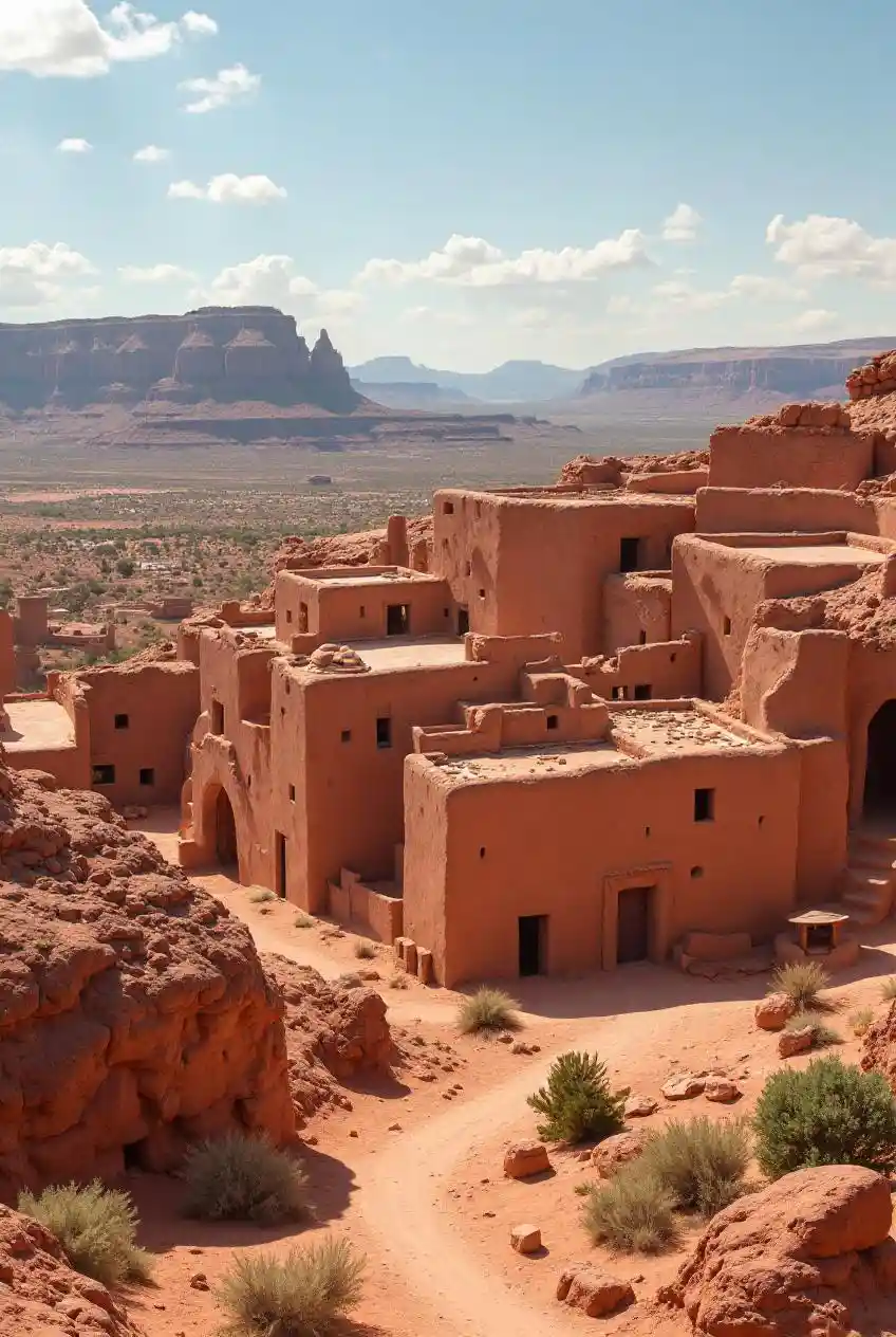 NoahGüneybatı'nın, kırmızı çöl manzarasıyla kusursuz bir şekilde karışan Adobe yerleşimleri.