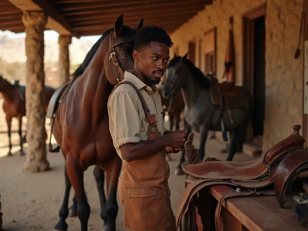Çölde ahırda deri bir eyer yaparak, 25'li yaşlarda siyah bir adam, sert önlük içinde parlıyor. Kumtaşı duvarları ve bağlanmış atlar onu çerçeve ediyor, usta elleri ve sakin odakları, sıcak, kırsal bir ortamda el yapımı tutku ve toprak çekiciliği ile.