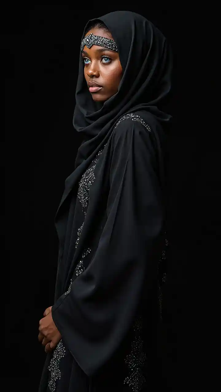 Bir güzel Afrikalı kadının Arap elbisesi ve elmaslardan yapılmış bir yüzü. Mavi gözleri ve koyu tenli. Elbise siyah ve hafif karmaşık desenleri var. Kadın siyah bir arka planda duruyor. Güzel bir poz var
