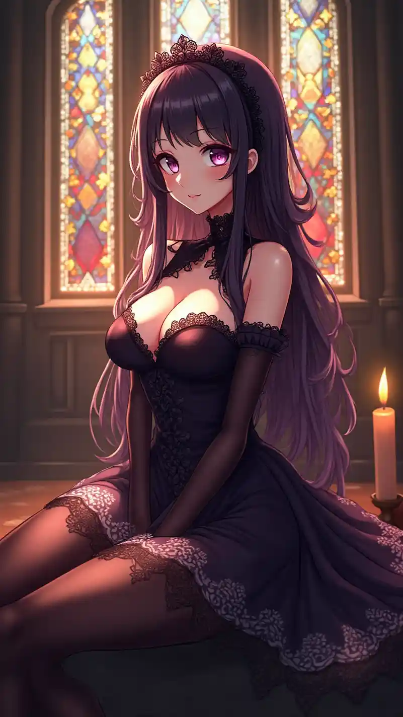 Vertical large-scale image of an Ultra HD anime girl, enchantingly gorgeous and divine, glowing under soft candlelight, sitting in an indoor gothic cathedral with stained glass windows, wearing a dark Lolita dress with a corset top and thigh-high stockings, her long hair adorned with a lace veil and a sultry smile, big shimmering eyes, glowing skin, deep purple and red color palette, soft features, bold makeup, sacred and ethereal vibes, warm lighting with a soft glow, accentuating her charming, well-defined chest with a subtle cleavage, and long, toned legs with a poised posture, radiating allure and divinity.