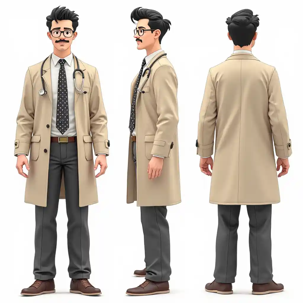Siyah saçlı, gözlüklü, bıyıklı, bej ceketli, beyaz bir arka planda üç açık görünümde görüntülenen ve eşitlik ve önemle düzenlenen fotorealistik bir erkek doktor 691f8152'nin tam vücut karakter listesi. Sol panel: tam anatomik ayrıntıları ve kıyafetleri gösteren ön görünüm. Merkezi panel: Karakterin yan siluetini, yüz profilini ve kıyafetini doğrudan yan perspektiften açıkça gösteren mükemmel 90 derece yan görünümü (profil). Sağ panel: arka görünüm, arka ayrıntıları ortaya çıkar. Üç bakış açısı da eşit ayrıntılı olmalı ve kompozisyonda eşit öneme verilmelidir.
