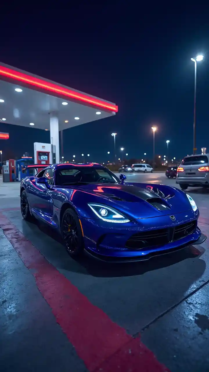 Gece yarısı benzin istasyonu Mavi Mor Dodge Viper ile karşılaşır