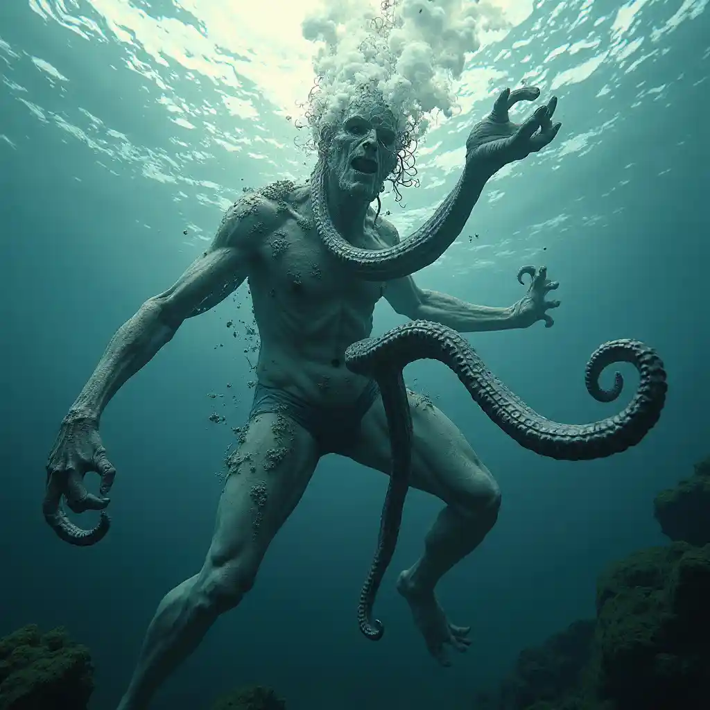 Sualtı sahnesi, yakın çekim, yakınlaştırma, sürreal dalgalar ve su yuvarlakları, dumanla iç içe geçen dokunaçlar, detaylı dokular, sinematik perspektif, yan görünümdeki karmaşık detaylar, hem 3D hem de 2D sanatı unsurları, çizim ve dijital resim birleşimi, ekstra uzuvları ile alışılmamış anatomi, yüzen ve bağlantı kesmeyen vücut parçaları, mutasyon ve soyut şekiller, bulan ve çarpık görseller, iki bacaktan daha fazlasını vurgularak, görsel açıdan çarpıcı ve rahatsız edici bir kompozisyon oluşturur.