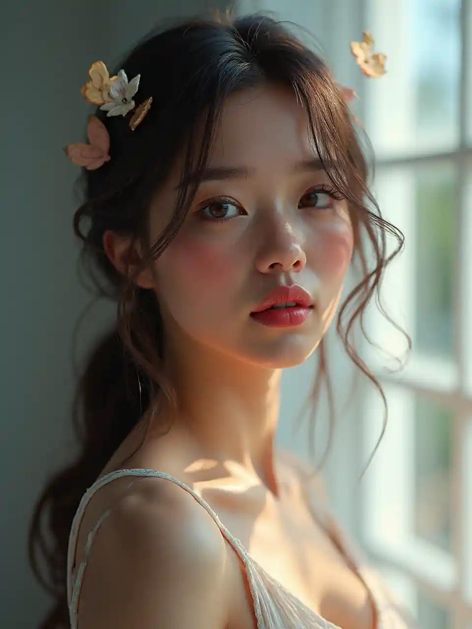High-quality work,Realistic works,Super premium graphics,8K HD CG works,high quality graphics,High-definition and exquisite CG works,10x pixels,Ultra-fine details:1.1,Advanced technical details:1.1Realistic photo effects,Interior lighting effects:1.5,natural soft light:1.5. Light effect(Virtual light effects:1.8),ultra high resolution,shining dress,sliver long hair,silber hair,transparenthair,high detailed hair(Quality hair details:1.1)Clear eyes,Double eyelids look good,Sharp eye makeup, Create exquisite eyelash makeup, tthin eyebrows, Ultra-detailed eyes,a tall nose, lovely red lips, rosey cheeks, With delicate makeup on her face , pretty face, The face shape is perfectly proportioned,(Advanced facial details:1.1) masterpiece photography nsfw that captures the essence of a dream experienced by an awesome mixed caucasian asian young woman, perfect beautiful detailed face, realistic skin pores, sharp clear eyes, (nipple slip), sheer revealing dress, enveloped in tendrils of smoke that morph into surreal butterflies around her, In the dream, she finds herself in a fantastical landscape filled with vibrant colors and surreal elements, The atmosphere is dreamy and ethereal, with soft glowing lights illuminating the scene, The young woman is depicted as confident and radiant, surrounded by symbols of her aspirations and inner strength, The overall mood of the image should evoke a sense of wonder, empowerment, and limitless possibilities, complex lighting, rimlight, (wind:1.3), ,Women's artwork,Dress full body video,Realism,Amazing Cleavage,My eyes are very bright today, casual photo