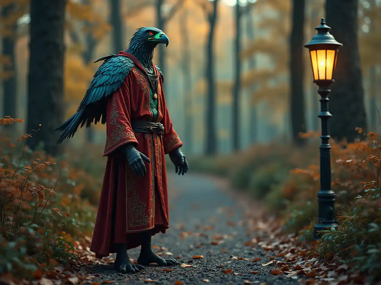 Mükemmel sonbahar ormanı, insan şeklinde bir kartal avcısı, çalılık bir yol ağaçların arasından geçiyor. Cildinin mavi ve yeşil neon rünleri var. Sahne, ince, canlı bir kartal kafası ile delici, parlak gözleri ile alçak açıdan çekilmiştir. Yansımalar yakın yüzeylere parlıyor ve ether ışığı yansıtıyor. Dans eden ateşböcekleri ile çevrili, eski bir lamba direği bir tuhaflık ekliyor. Kartal avcısı güçlü bir varlık yansıtan dinamik bir poz verir. Eşsiz olmalarına rağmen, insan yüzü ve elleri yumuşak bir şekilde, dostça ifade ediliyor. Birbirine karışan parmaklar gibi biraz değişen özellikler, mistik çekiciliği artırır. Ama oranlar dengede kalır, merak ve hayal gücünü çalar. Etrafındaki ormanın sessiz renkleri canlı detayları artırır ve büyüleyici bir atmosfer yaratır.