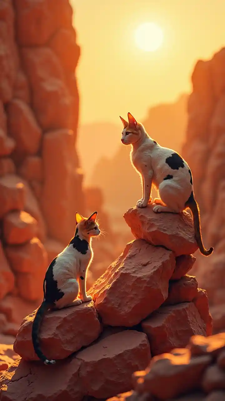 YamyMısırlı mistik kediler, inek desenleri ile, güneş ışığında kırmızı kayalara tırmanıyorlar