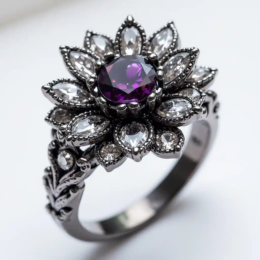 Koyu mor elmas bir merkez ve etrafını aydınlatan elmas yaprakları ile lüks siyah altın bir yüzük.