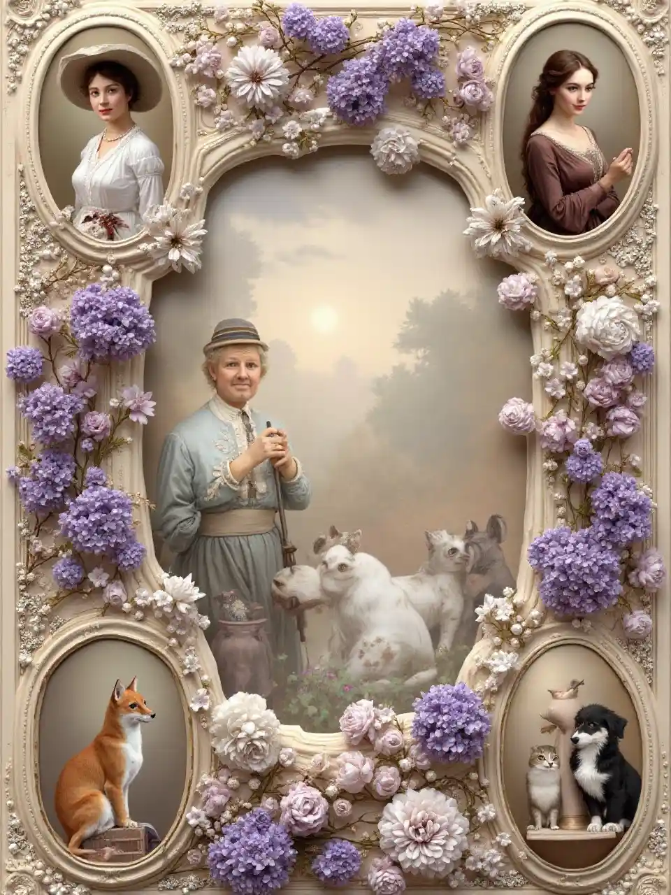 A luxurious composition in the form of a dense frame of 30 carefully selected photos in a lilac-beige palette. Photos of different sizes and shapes create a rich multilayer collage, decorated with exquisite decor elements " 🖼️ Details of images (30 photos): 10 portraits: 3 female (in a hat with a veil, with a fan, with a mirror) 3 male (with a cane, with a pipe reading) 2 children's (with a toy, in a lace dress) 2 groups (family portrait, friends for tea) 8 animals: 3 cats (white, redhead, black) 2 dogs (retriever, dachshund) 1 owl 1 fox 1 butterfly on flower 7 landscapes: 2 city (street with lanterns, view of the bridge) 3 natural (forest in fog, mountain lake, Makov Field) 2 sea (storm, calm sunset) 5 still lifes: 2 with books (old folio, open diary) 2 with dishes (porcelain service, copper kettle) 1 with musical instruments (violin with notes) 🌸 Decor elements (reinforced): Thick branches of heather and violets creating transitions between the photo Pearls and individual beads of different sizes Lace inserts with a floristic pattern 3 wax seals (with different symbols) Gilded corners in the 5 largest photos Dried flowers in transparent envelopes 🎨 Improved stylistics: Style: "Rich Victorian Album" Colors: Basic: dusty rose, lavender, ivory Accents: gilding, dark-bearded Textures: The silk base Aged paper Matte pearls ✨ Special effects: 2 photos with the effect of "faded picture" 1 photo with tissue silver pattern Artificial shadows for volume Microscopic dust dust ⚙️ Optimal settings: Style: Victorian Elegance Effects: Soft Glow, Aged Photo Ratio: 16: 9 (for a wide frame) Details: Ultra HD 📝 Note for the neural network: "Imagine a family relic - a precious album that generations filled with the most important memories. Each element should breathe history and nobility" 🚫 undesirable elements: Modern items (gadgets, plastic) Bright unnatural colors Excessive symmetry Digital artifacts