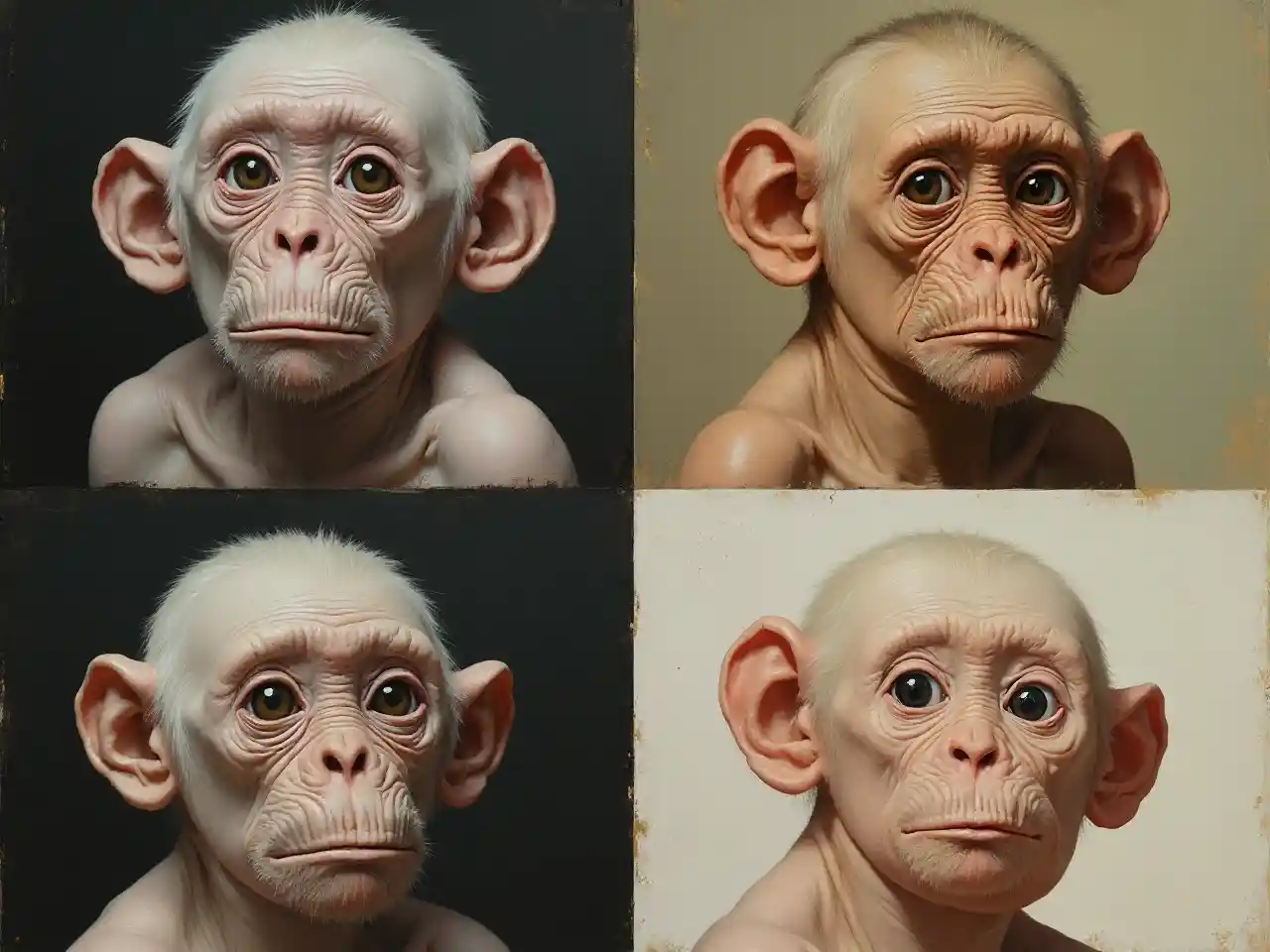 İçi zayıf, antropomorfik, saçsız, albino bir şempanzenin yakın görünümü. Tablo çeyreklere ayrılmıştır. Sağ üst çeyreği H.R. Gieger'in resim tarzında. Sol alt çeyreği René Magritte'nin resim tarzında yapılmıştır. Sol alt çeyreği Norman Rockwell'in resim tarzında. Alt sağ çeyreği Shawn Tan ve Hieronymus Bosch'un resim tarzında yapılmıştır.
