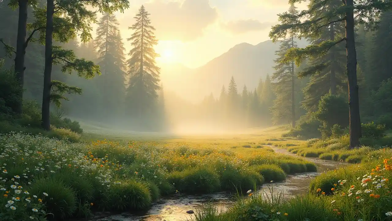 Etreyen manzara, sisli sis, yüksek ağaçlar arasından süzülen altın güneş ışığı, yeşil çayırlara yayılmış canlı yaban çiçekleri, sahneyi dolaşan nazik bir akar, huzurlu bir ortam, yeryüzünde oynayan yumuşak gölgeler, kat derinliğe sahip büyüleyici bir atmosfer, pastel renlerle boyanmış sakin bir gökyüzü, görkemli bir arka plan sağlayan uzak dağlar.