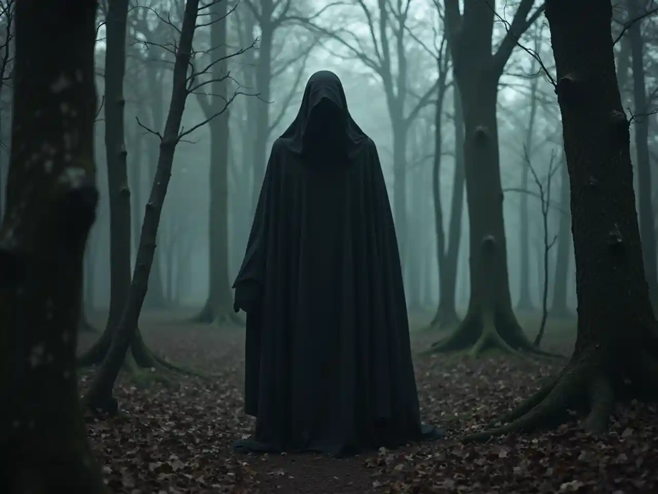 Karanlık bir ormanda yüzsüz, kolsuz siyah görüntüsü