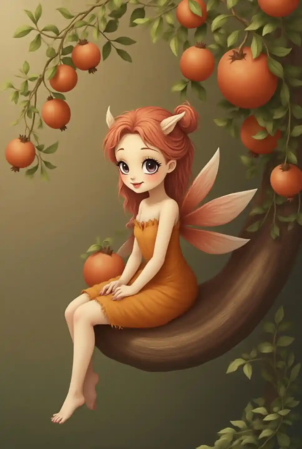 EvelynHassas bir peri, hassas bir yüz ve zeytin derisi olan peri, olgun meyvelerle asılmış yumuşak portakal bir palet nar ağacında zarif bir şekilde oturur. Onun hapisi