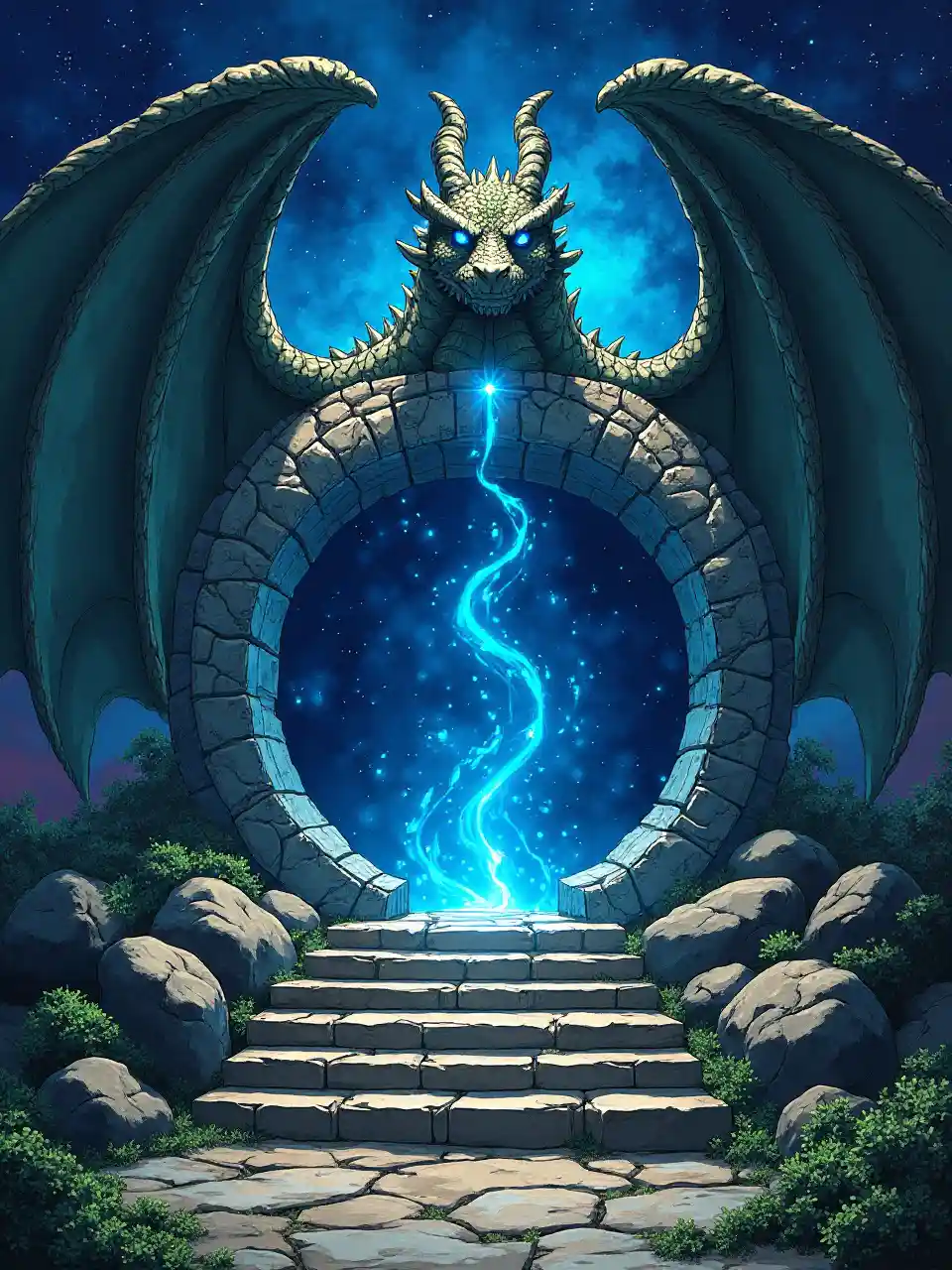 Çizgi roman tarzı illüstrasyon, ejderha temalı portal, Stargate ve Yüzüklerin Efendisi'nden ilham aldı, merkezinde kozmik büyü, her iki tarafta da taş ejderha kanat duvarları oluşturur. Taş ejderha başı, aşağı bakıyor, parlak mavi gözleri, merkezine giden taş ramp