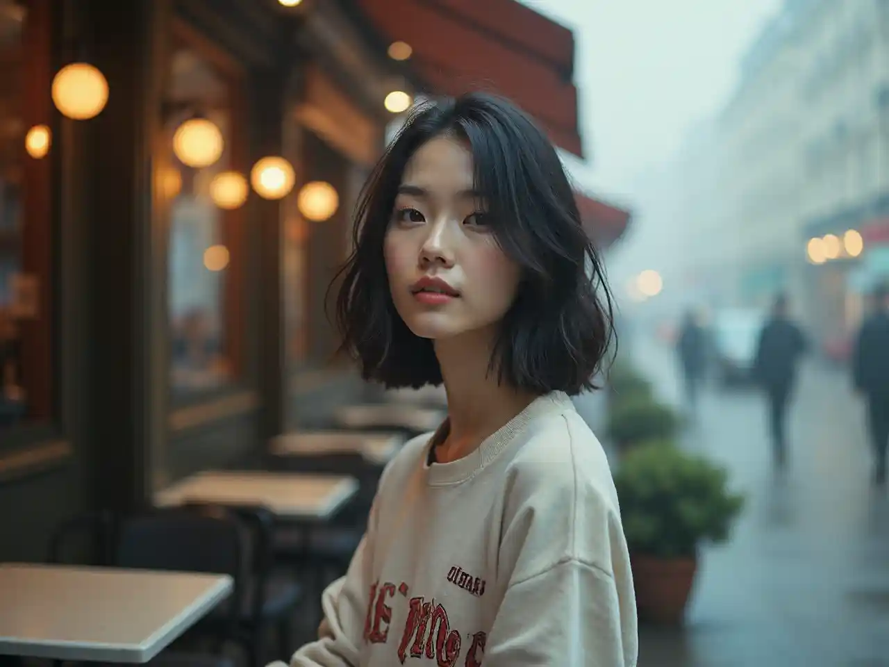 Bob kesilmiş saçları ve sportif bir giysisi olan güzel bir Japon moda modelinin portresi, etherik rüya gibi sisli, Henri Cartier Bressons tarafından çek, editörlük moda dergisi, Paris kafe terası önünde moda pozları