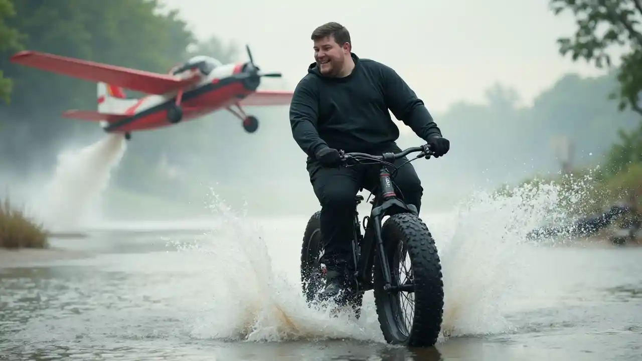 Şişman Bisiklet 01. Daha fazla su. Tamamen siyah giyinmiş, yan taraftan görülen, siyah şiş bisikletinde gülüyor, yükseklerde sıçrayan bir su birikintisinde oturuyor. Arkasında yangın samanyolu su atıyor