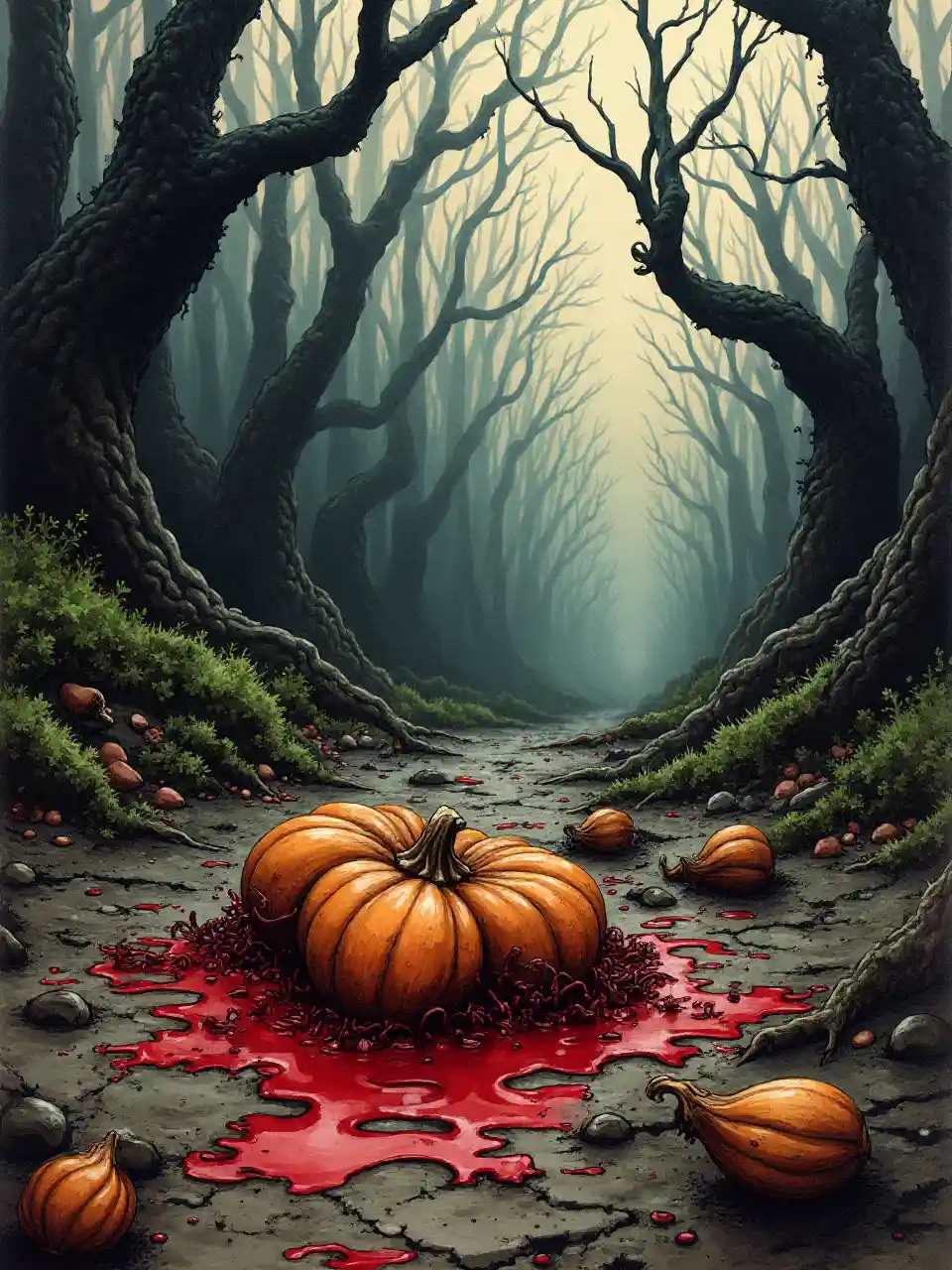 (Küçük ölçekli, kabak tohumlarının yakınlaştırılması) saçılmış ve kısmen koyu kırmızı sıvıyla ve karışık pulla kaplanmış, hafif bir sis altında bir meşeli zeminde durmaktadır. Etraftaki ağaçlar çarpık ve çıplak, karanlık bir arka plana. :: karanlık fantezi korku illüstrasyonu :: mürekkep ve grafit çizim tarzı :: (elle çizilmiş görünüm) Gerald Brom, Ian Miller, Zdzisław Beksiński :: ((küçük doku))) :: ((huysuz atmosfer)) :: ürkütücü, antik, doğal olmayan