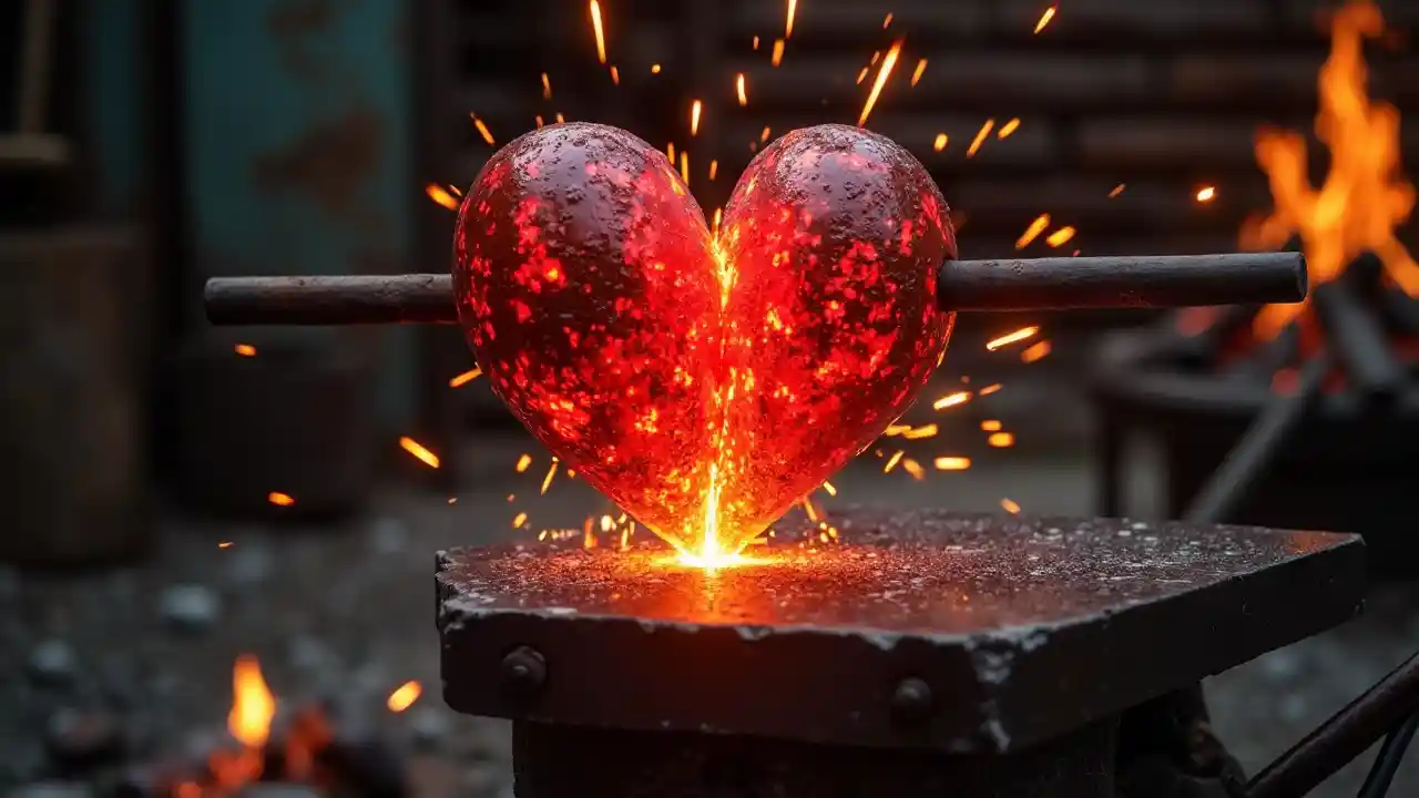 Bir kürek üzerine yapılmış bir çelik kalbin fotoğrafı. Kalbi kırmızı ve turuncu, ondan kıvılcımlar uçuyor. Yüzeyinde ışık izleri oluşuyor. Arkaplan ateş ve aletler içerir.