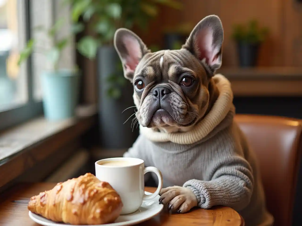 Sevgili Fransız Bulldog Kafede Kahve ve Croissant'ın tadını çıkarıyor